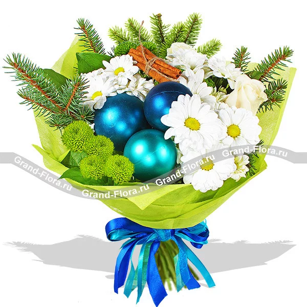 Уменьшенный: хризантема белая - 2шт., роза белая - 1шт., хризантема зеленая (сантини) - 1шт., еловая ветвь, корица, новогодний декор и зелень, фетр.
