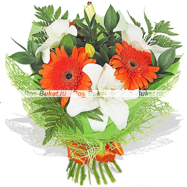 Стандартный (на фото): лилия белая - 1 шт, гербера оранжевая  - 3 шт, рускус, папоротник - 3 шт, фетр розовый.