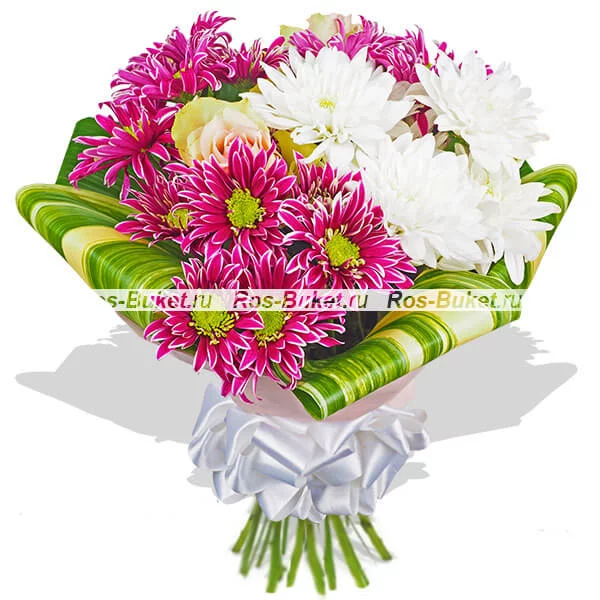 ДЕЛЮКС: хризантема кустовая фиолетовая - 7 шт, хризантема кустовая белая - 6 шт, роза розовая (в центр) - 5 шт, лист аспидистры загнутый - 7 шт, фетр светлый, бант белый.