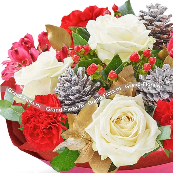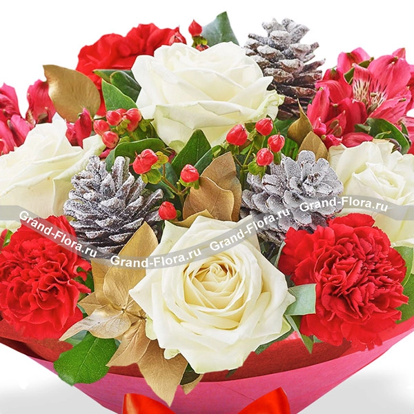ДЕЛЮКС: роза белая - 11 шт., гвоздика красная - 5 шт., гиперикум - 2 шт., альстромерия красная - 5 шт., шишки - 3 шт., эвкалипт - 4 шт., фетр розовый, бант красный, шоколадка Dove в подарок.
