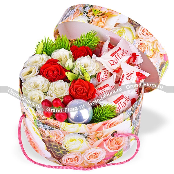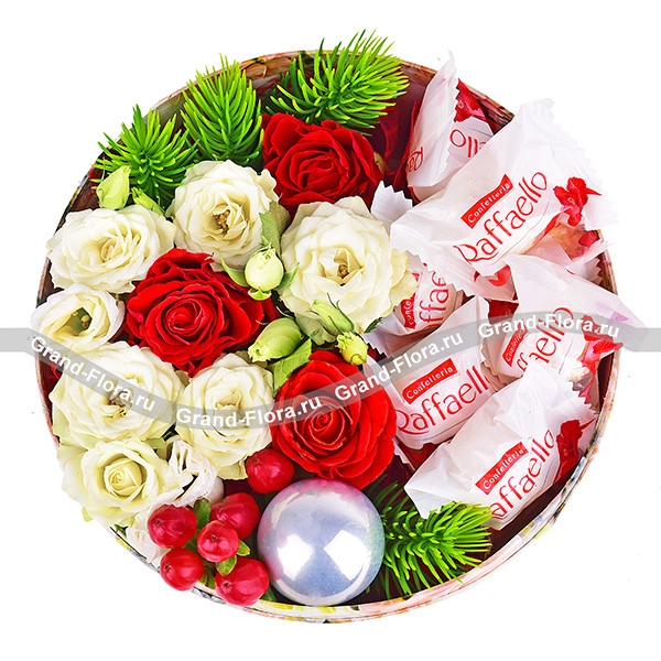 Стандартный: роза красная - 3 шт., роза кустовая белая - 3 шт., гиперикум - 1 шт., ель, конфеты Raffaello, елочная игрушка – 1 шт., оазис, коробка.