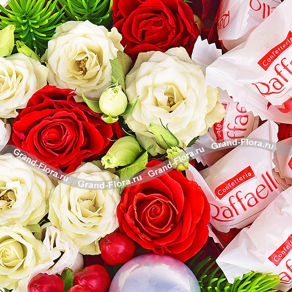 ДЕЛЮКС: роза красная - 9 шт., роза кустовая белая - 8 шт., гиперикум - 4 шт., ель, конфеты Raffaello, елочная игрушка – 4 шт., оазис, коробка.