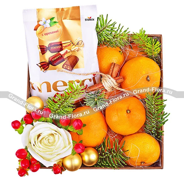 Стандартный (на фото): роза белая - 1шт., гиперикум - 1шт., ель, елочные игрушки -3 шт., корица - 2шт., мандарины - 0,5 кг., конфеты "Merci", коробка.