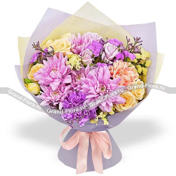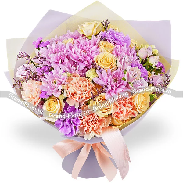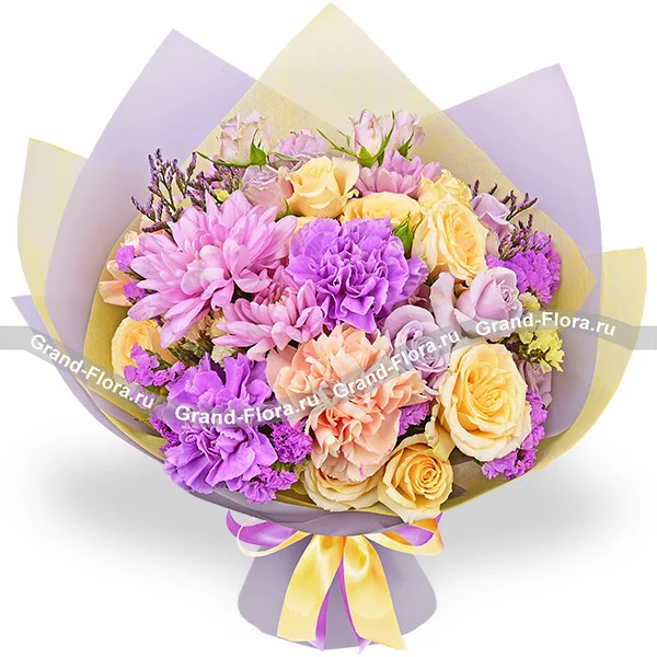 Люкс: гвоздика фиолетовая - 3 шт., гвоздика персиковая - 4 шт., хризантема кустовая ромашковая фиолетовая - 3 шт., кустовая роза желтая - 3 шт., кустовая роза фиолетовая - 2 шт., статица, лимониум, упаковка, лента. Примерный размер: 40Х40 см.