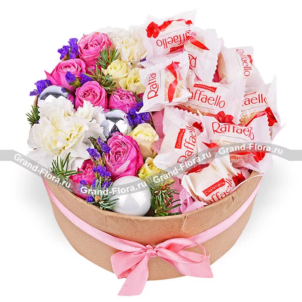 Стандартный: диантус белый - 2 шт., роза кустовая белая - 1 шт., роза кустовая розовая - 2 шт., статица, ель, конфеты "Raffaello" - 150 гр., новогодний декор, оазис, коробка.