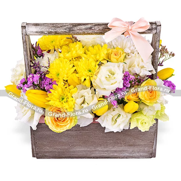Стандартный: хризантема кустовая желтая - 3 шт., тюльпан желтый  - 9 шт., роза кустовая желтая- 2 шт., эустома белая - 3 шт., хризантема одноголовая белая - 2 шт., статица, лимониум, бант, оазис, деревянный ящик. Примерный размер: 30Х30 см.