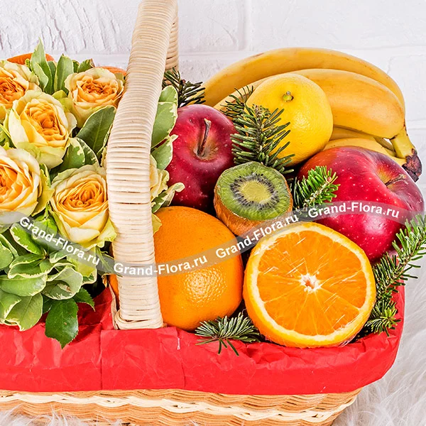 Уменьшенный: апельсины - 2 шт., яблоки - 1 шт., лимоны - 1 шт., киви - 1 шт., бананы - 1 кг., оазис, роза кустовая кремовая - 2 шт., декоративная зелень, ель, декор, корзина малая.