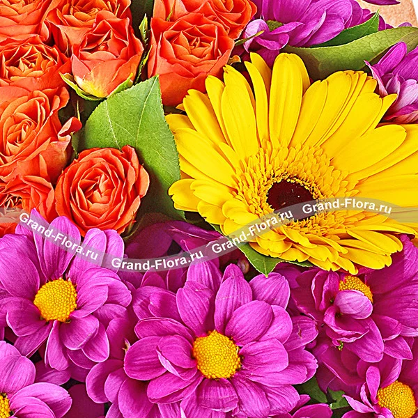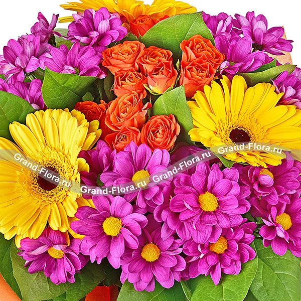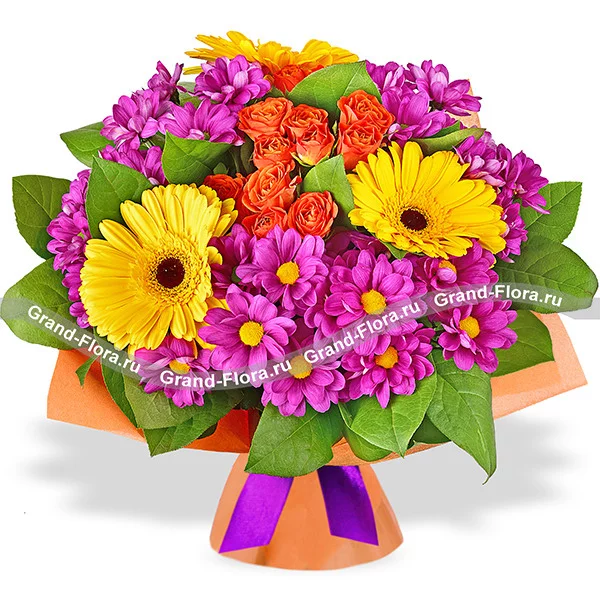 Аккуратный и стильный  букет непременно вызовет восхищение своего счастливого обладателя. Сочетание оранжевых кустовых роз и фиолетовой хризантемы на фоне крупных цветков желтой герберы подчёркнуто насыщенно-зелёными листьями салала. Совершенство можно подарить, когда оно воплощено в цветах.